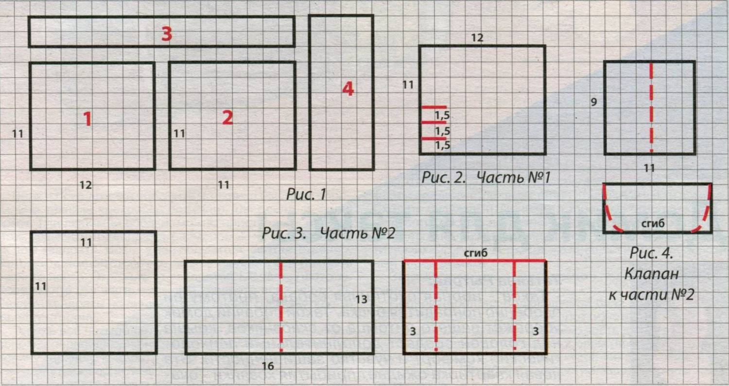 Вам потребуется: мелкие лоскуты хлопковых тканей ярких цветов с «богатыми» рисунками, плотная сорочечная ткань для основы и подкладки, фатин золотистого оттенка, плотная бязь для основы, двухсторонний клеевой флизелин «паутинка», молния 20 см, две пришивные кнопки, прочная хлопковая ткань для обтачки. Подготовьте внешнюю часть кошелька. Из плотной сорочечной ткани выкроите лоскут 30 х 15 см, на него можно проложить тонкую синтепоновую прокладку. Следующий слой - двухсторонний клеевой флизелин «паутинка». Сверху аккуратно выложите квадратики 2 х 2 см красивых ярких тканей, чтобы вся основа была закрыта. Аккуратно проутюжьте это произведение утюгом, оставьте остыть. Сверху положите фатиновую сетку, сколите булавками. Самый сложный этап - стежка. Все слои надо часто простегать, закрепляя мелкие лоскуты между слоями. Подровняйте получившуюся внешнюю деталь кошелька до размера 25 х 12 см. Соберите внутреннюю часть кошелька последовательно, как показано на рисунке 1. Она состоит из четырех частей. Из плотной сорочечной ткани выкроите деталь 11 х 12 см, дополнительно выкроите четыре кармана под визитки размером 6,5 х 12 см, детали карманов подогните по верхнему краю, нижний край настрочите на деталь основы на расстоянии 1,5 см от нижнего края (рис.2). Приготовьте вторую часть кошелька. Выкроите основу 11 х 11 см. Отдельно выкроите карман-портфельчик для мелочи размером 16 х 13 см. Перегните пополам по длинной стороне изнанка к изнанке, поверните сгибом вверх. Отогните по 3 см от края карманчика и застрочите на 2 мм от сгибов (красные пунктирные линии на рис.З). Приложите карман-портфельчик к нижнему краю основы (деталь 11x11 см), пристрочите карман по боковым сторонам. Приготовьте клапан: выкроите деталь 9 х 11 см, проклейте клеевым флизелином, перегните по длинной стороне лицом к лицу, прошейте, как на рис.4. Выверните клапан, пришейте над карманом. На клапане и кармане пришейте кнопку. Сшейте детали 1 и 2, проклейте по изнанке с подкладочной тканью при помощи двухстороннего клеевого флизелина «паутинки». Подготовьте деталь № 3. Выкроите полосу 4x21 см, проклейте клеевым флизелином, перегните по центру по горизонтали изнанка к изнанке. Между деталями 1+2 и 3 вшейте молнию. Выкроите деталь 4 размером 6x13 см. Пришейте ее к деталям 1+2+3. Наложите внутреннюю деталь кошелька на внешнюю деталь («пицца»), сколите, окантуйте косой бейкой. Пришейте завершающую деталь - кнопку.
